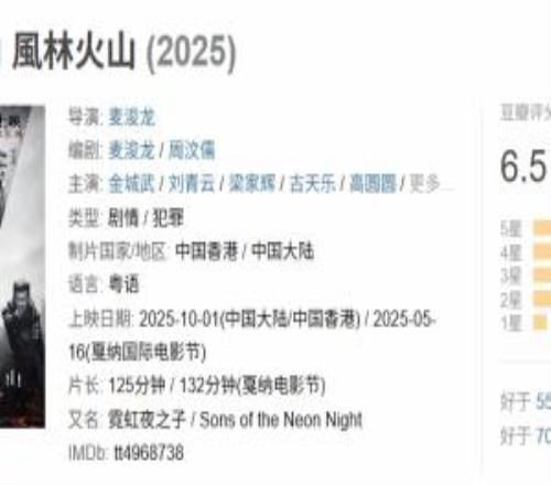 体育资讯10月2日称 今日,电影《风林火山》豆瓣评分解禁,截止发稿前,豆瓣评分6.5分。
