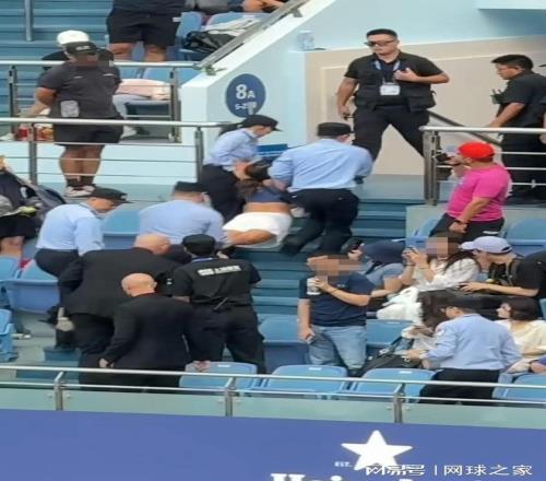 在今天下午中央球场第二场比赛,意大利球员贝雷蒂尼比赛时,有一位女观众(疑似贝雷蒂尼女球迷)带着混血小朋友,在球员比赛过程中不断大声尖叫干扰比赛正常进行,随后当场主裁对这名观众给予警告,球场内的安保人员也在第一时间对这名女士进行劝阻,然而,该名女子却拿出自己的护照和身份证不断展示给安保人员,声称其无权干涉自己的行为,后续还不断对场内安保人员挑衅,并用手和肩膀与安保人员发生肢体冲突,这导致比赛被迫终止。随后,安保人员将女子孩子带离球场后,几名安保人员将该女子抬出球场,而全场观众也用掌声回应上海大师赛的处理方式!