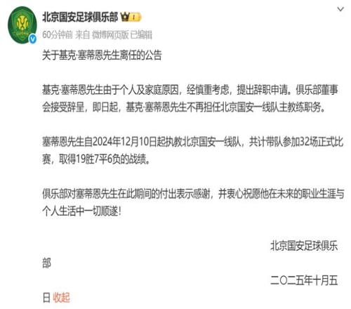 基克·塞蒂恩先生由于个人及家庭原因,经慎重考虑,提出辞职申请。俱乐部董事会接受辞呈,即日起,基克·塞蒂恩先生不再担任北京国安一线队主教练职务。 塞蒂恩先生自2024年12月10日起执教北京国安一线队,共计带队参加32场正式比赛,取得19胜7平6负的战绩。 俱乐部对塞蒂恩先生在此期间的付出表示感谢,并衷心祝愿他在未来的职业生涯与个人生活中一切顺遂!